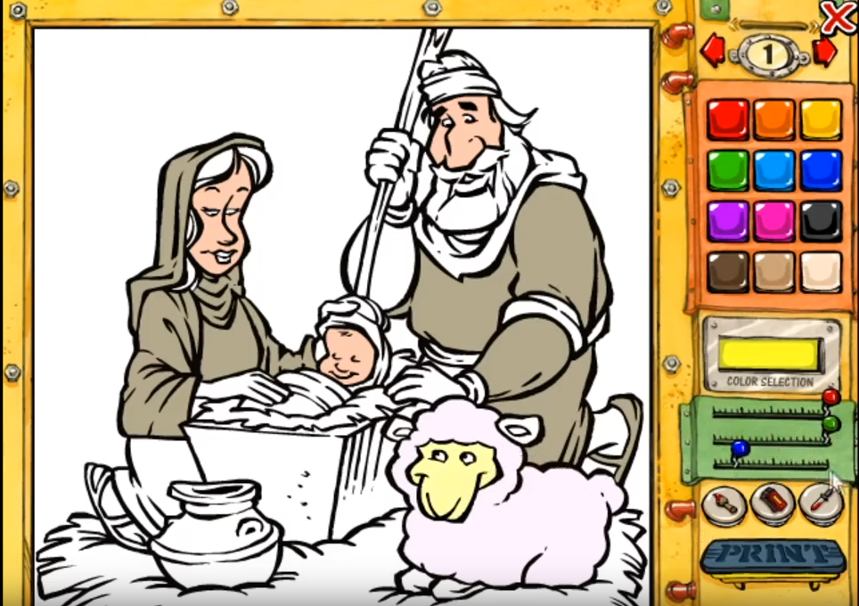 Other mini-games include an obnoxious sort of keep-away where you have to move around construction cones in order to guide a worker to the right level of a building. It’s obnoxious both because the timing is so finicky, and because the worker says something every single time you move him. His snarky, nasal voice saying, “I’m not sure you know where you’re going,” still makes my blood boil. There’s also a coloring page section that allows you to color pictures from various stories in the Bible, such as the birth of Jesus. See my Crayola Vehicle Voyages article for why that isn’t exactly my cup of tea.