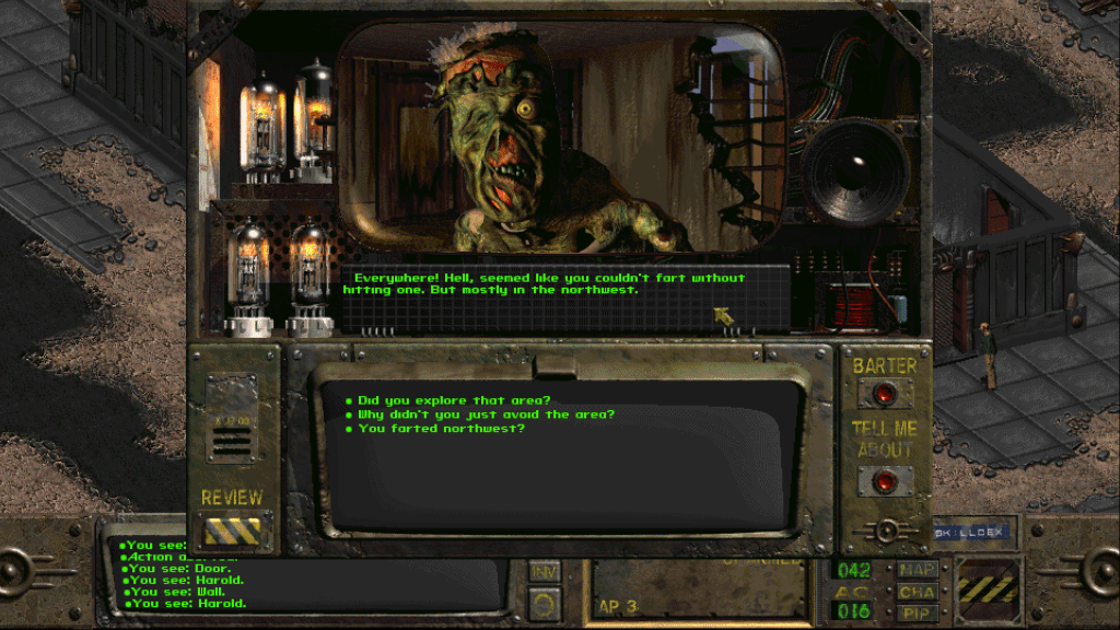 My conversation with Harold is fascinating. He is even better than Beth in terms of organically providing information about the world, as it is presented as part of his life story. Harold, once a very successful trader, became mutated at Mariposa military base when a mutant-tracking expedition went horribly wrong. Harold is, understandably, a little rough around the edges, a little impatient with stupid responses, but on the whole, a nice guy.