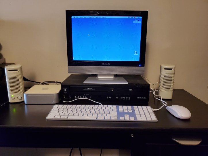 After a botched Facebook Marketplace deal our hardware guy Kris bought me a Mac Mini G4. It’s a very small, compact machine. The only thing in front is Apple’s “SuperDrive” which reads CD and DVD formats. All the input/output ports are in the back. It is great for someone like me with dwindling space.