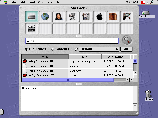 Modern day Macs have Spotlight. It’s an application that easily searches your drives (or the internet) quickly using whatever keyword you typed. OS 9 has the same kind of thing but called Sherlock. In my case, I have Sherlock 2. I don’t think I’ll ever fill up my drive to the point of needing this program but it’s still pretty cool and more efficient than Windows File Explorer.