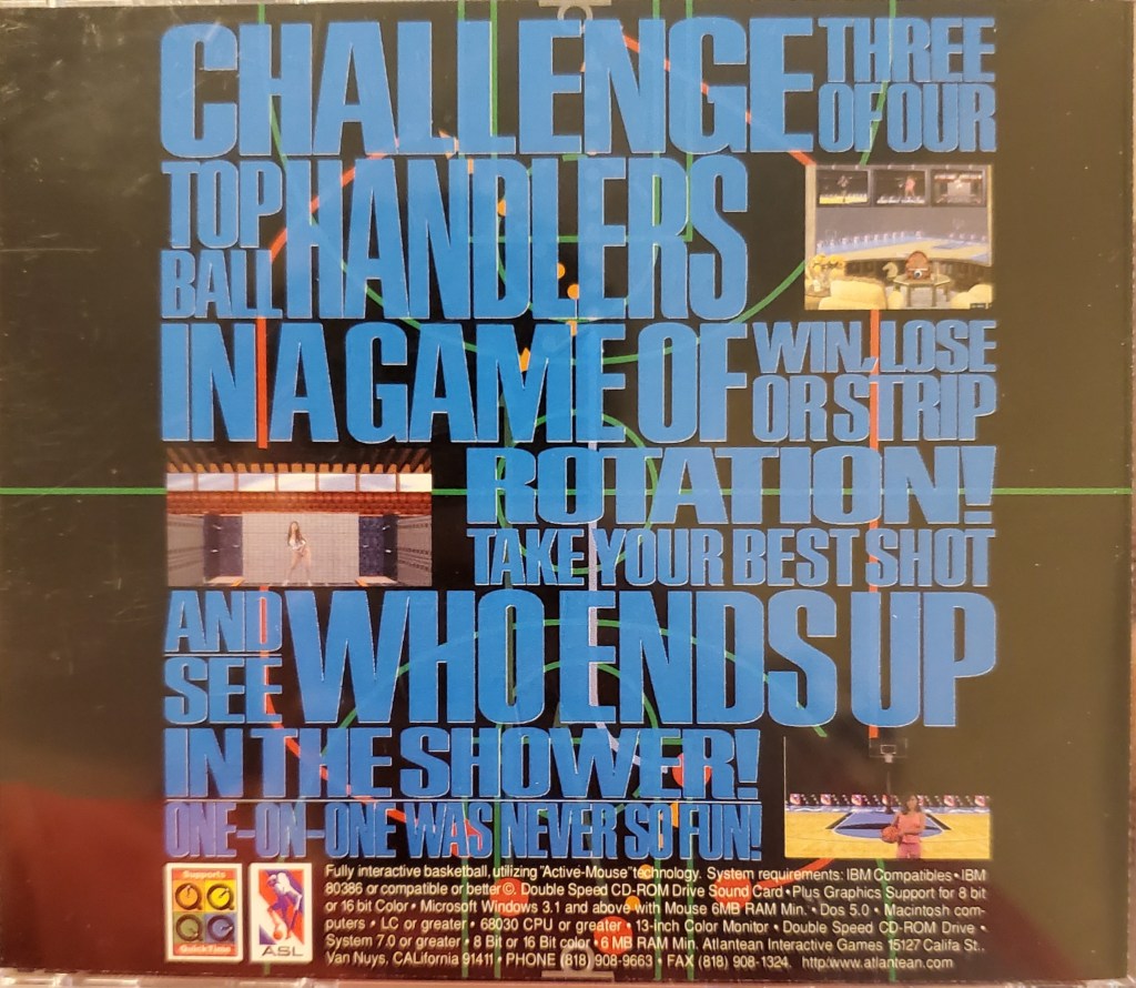 The back of the jewel case states “Challenge three of our top ball handlers in a game of win, lose or strip rotation! Take your best shot and see who ends up in the shower! One-On-One was never so fun!”