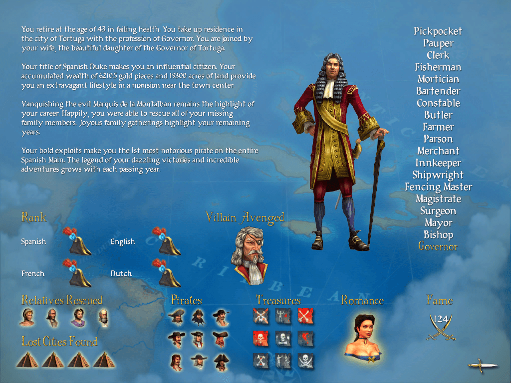 After marrying the governor of Tortuga’s daughter; finding all my missing family members, all lost civilizations, and all known buried treasure; and becoming the most notorious pirate in the Caribbean, I retired from pirating at the age of 43. I was in failing health, and my land-locked occupation was being the governor of Tortuga. This was fun, as I got to create a head canon around the idea that once my father-in-law passed, I had the wealth, influence, and family connections to easily become governor and live out the rest of my days in comfort.