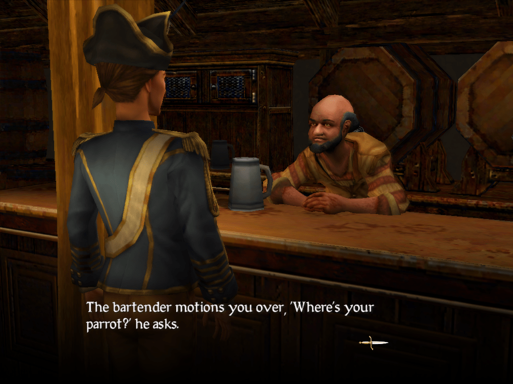 When you arrive at a port, you have a variety of things you can do, from visiting the leader to getting your ship serviced. But my favorite thing to do was to visit the tavern. In the tavern, you can recruit men for your crew, purchase rare items or information from a shady man in the corner, or hear gossip from the barmaid or barkeep. Talking to the barkeep is my favorite, because if he has no juicy information to share, he will simply ask you about your parrot.