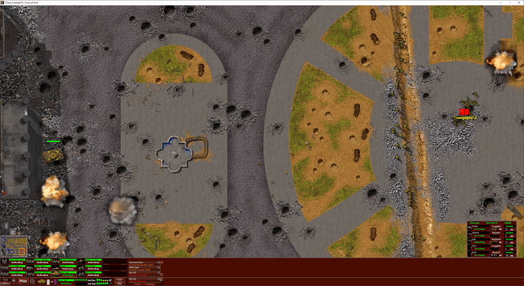 The immediate danger across the Konigsplatz is nearly a half dozen Russian tanks and self-propelled guns (SPGs), each traversing to focus fire on the Tiger tank. Fortunately, the final Tiger immediately adds a kill-ring to it’s barrel by knocking out an unfortunate T-34-85 tank as shells nearly miss the perched royal beast.